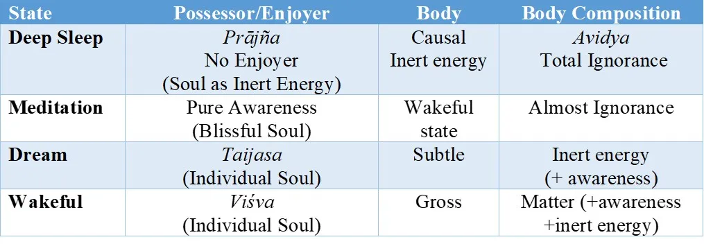 The individual soul in the wakeful state is called the viśva. Here, we must note that in the wakeful state, the viśva, which is aware, interacts with matter and inert energy. In this state, awareness, matter and inert energy are present together. Yet, this state is identified only by the additional appearance of matter compared to the dream state (in dream state awareness and inert energy exist together without any contact with matter of gross body). Similarly, in the dream state, the taijasa, which is aware, interacts with inert energy only. In this state, awareness and inert energy are present. Yet, this state is identified by the additional appearance of inert energy compared to the deep sleep state. In the third state of deep sleep, the prājña of the ordinary human being is total ignorance or avidyā and it represents the causal body (because non-aware ignorance is inert energy, which is the cause of the world). The living gross body consisting of matter and energy exists throughout all three states. But, it is not considered in the deep sleep and dream states since it is not grasped by the enjoyer (taijasa) of the dream state and also non-existing enjoyer of the deep sleep state called prājña. The Praajna remaining as the inert energy is fully inert in deep sleep. The gross body is grasped only in the wakeful state by the viśva, which is the enjoyer of that state. Hence, the gross body is considered only in the wakeful state.